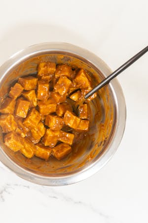 - Once the tofu is done roasting, add it to the mixing bowl in which the peanut sauce is prepared and toss until well-coated.